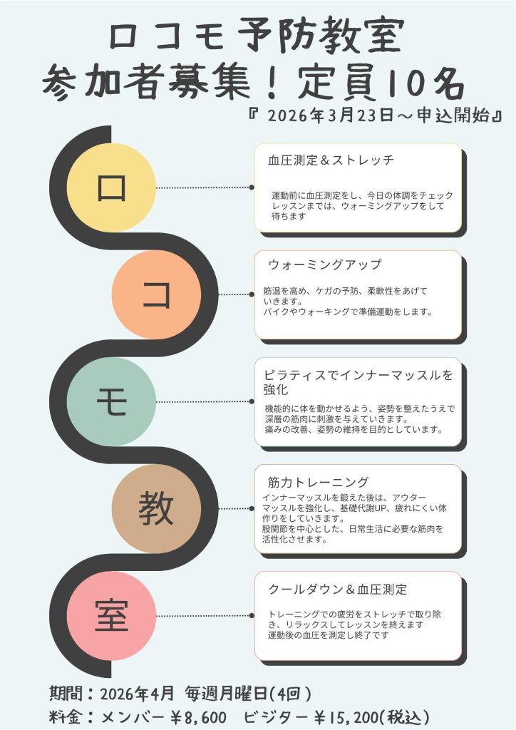 ロコモ予防教室参加者募集 本日より参加者募集を行います。 4月4回の少人数レッスンです。 いつまでも自分らしくいられるための体力づくりを 一緒に行いましょう。 見学・体験もお待ちしております。